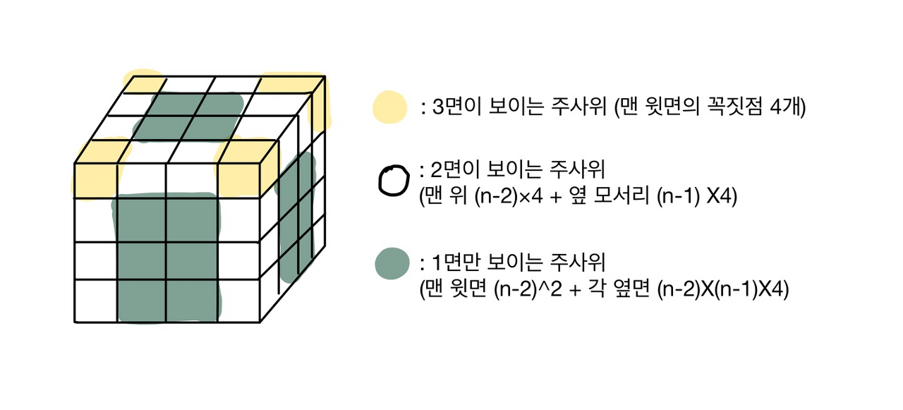 그리고, 아까 말했던 1면/2면/3면이 보이는 주사위의 갯수는 그림을 그려보면 금방 규칙을 찾을 수 있다.