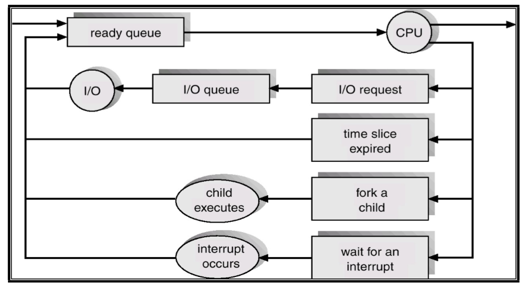 Ready queue에 있던 프로세스가 CPU할당을 받아서 Running상태가 된다. 이때, I/O 요청, Timer interrupt, Interrupt이 발생하면 하던 작업을 중지하고 waiting 상태로 갔다가 다시 Ready queue에 들어가서 CPU 할당받기 위해 대기한다.