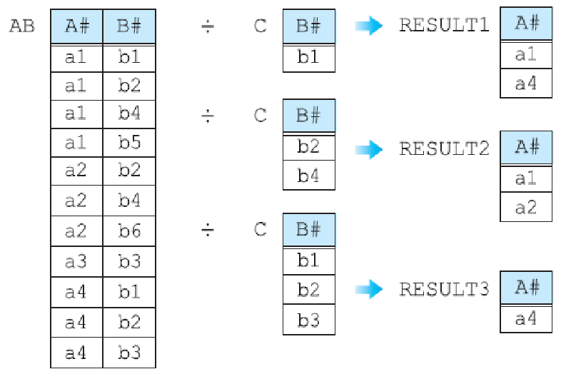 - 차수가 n+m인 릴레이션 R(A1, A2, ..., An, B1, B2, ..., Bm)과 차수가 m인 릴레이션 S(B1, B2, ..., Bm)의 디비전 R ÷ S는 차수가 n이고, S에 속하는 모든 투플 u에 대하여 투플 tu(투플 t와 투플 u을 결합한 것)가 R에 존재하는 투플 t들의 집합