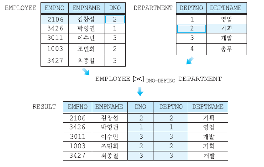 - 두 릴레이션의 카티션 곱에 조인조건을 적용한 결과와 동일