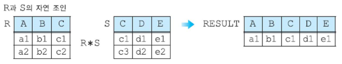 - 두 릴레이션의 공통된 애트리뷰트에 대해 동등 조인을 수행하고, 동등 조인의 결과 릴레이션에 있는 두 개의 조인 애트리뷰트 중 하나를 제외한 조인