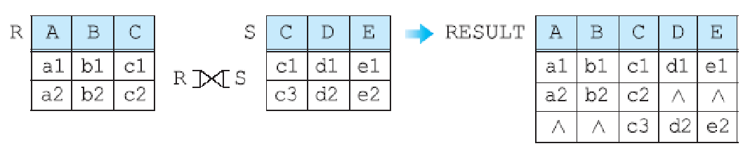 3. 완전 외부 조인(full outer join) : R과 S의 모든 투플들을 결과에 포함시키고, 만일 상대 릴레이션에 관련된 투플이 없으면 결과 릴레이션에서 상대 릴레이션의 애트리뷰트들은 널값으로 채움