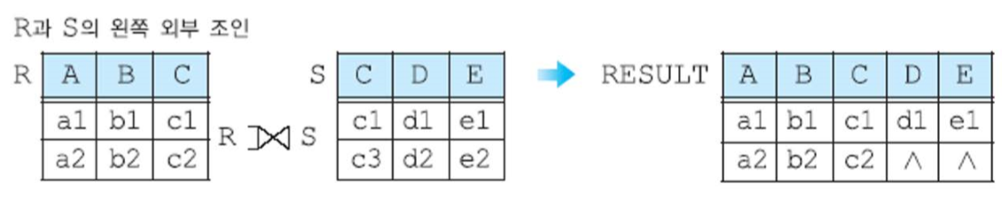1. 왼쪽 외부 조인(left outer join) : 릴레이션의 모든 투플들을 결과에 포함시키고, 만일 릴레이션 S에 관련된 투플이 없으면 결과 릴레이션에서 릴레이션 S의 애트리뷰트들은 널값으로 채움
