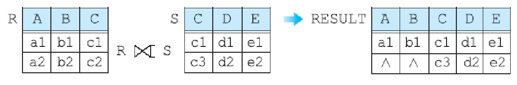 3. 완전 외부 조인(full outer join) : R과 S의 모든 투플들을 결과에 포함시키고, 만일 상대 릴레이션에 관련된 투플이 없으면 결과 릴레이션에서 상대 릴레이션의 애트리뷰트들은 널값으로 채움
