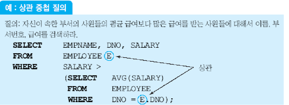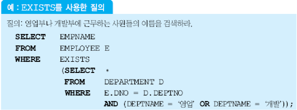 - EXISTS : 중첩 질의의 결과과 빈 릴레이션인지 여부를 검사함. 빈 릴레이션이 아니면 참이고, 비어있으면 거짓