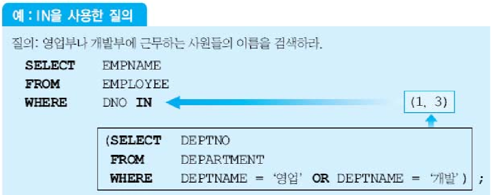 - IN : 한 애트리뷰트가 값들의 집합에 포함되어 있는지 테스트