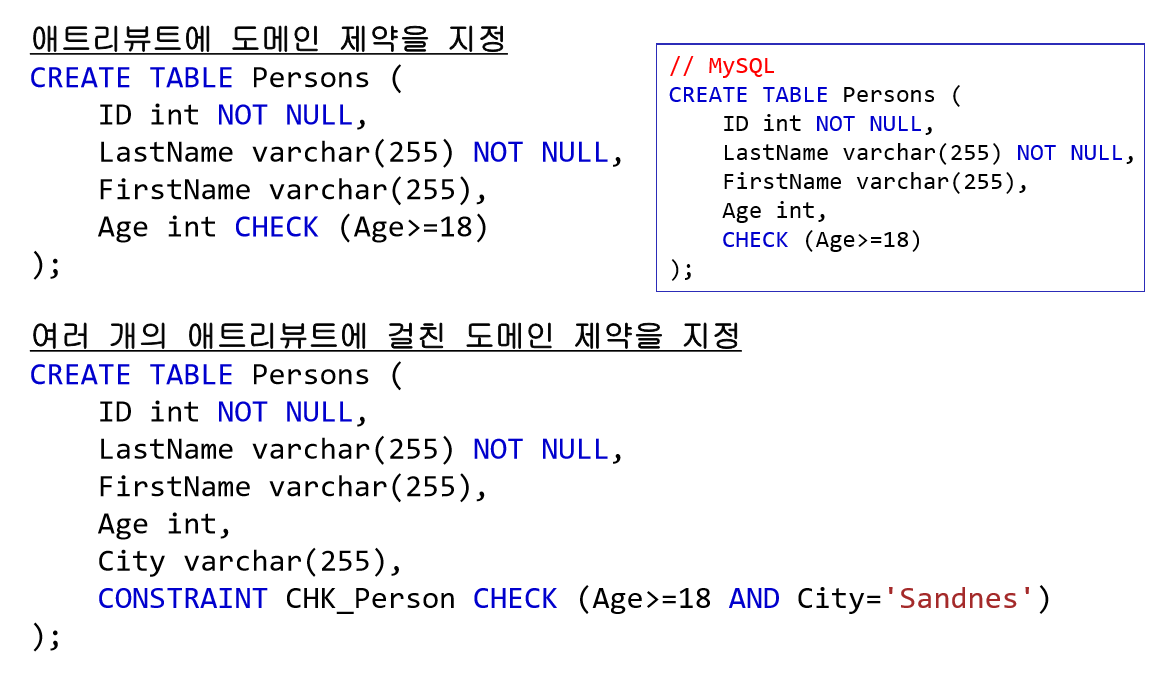 - CHECK 제약조건을 통해 값의 범위를 제한할수 있음