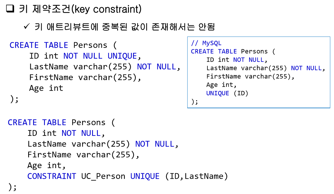 - 키 애트리뷰트의 중복된 값을 막기 위해 UNIQUE 사용